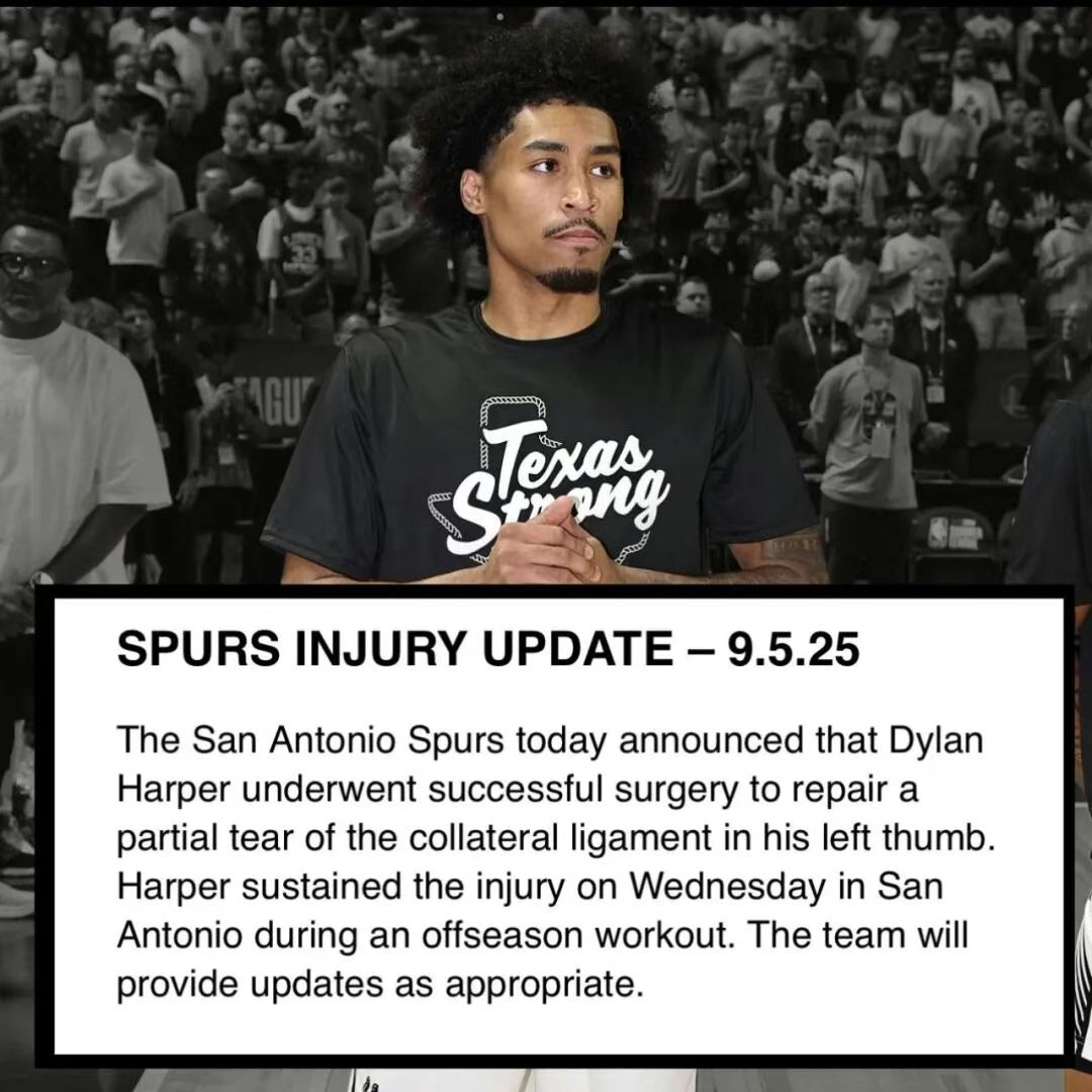 北京时间9月8日,马刺队官方宣布重磅消息:今年榜眼秀迪伦-哈珀在训练中遭遇左手拇指韧带部分撕裂,已经成功接受手术。球队表示哈珀有望赶上10月23日的常规赛揭幕战,但根据该手术平均54.3天的恢复期计算,他很难如期复出。